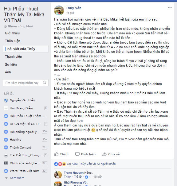 Dưới đây là một lời chia sẻ của một khách hàng trong group Hội phẫu thuật thẩm mỹ tại Mika Vũ Thái.