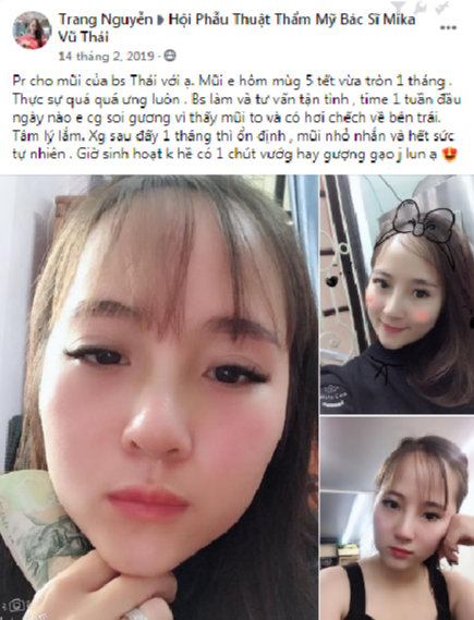 “ Pr cho mũi của bác sĩ Vũ Thái với ạ. Mũi em hôm mùg 5 tết vừa tròn 1 tháng . Thực sự quá quá ưng luôn. Bác sĩ làm và tư vấn tận tình, thời gian 1 tuần đầu ngày nào e cũng soi gương vì thấy mũi to và có hơi chếch về bên trái. Tâm lý lắm. Xong sau đấy 1 tháng thì ổn định, mũi nhỏ nhắn và hết sức tự nhiên. Giờ sinh hoạt không hề có 1 chút vướg hay gượng gạo gì luôn ạ.”