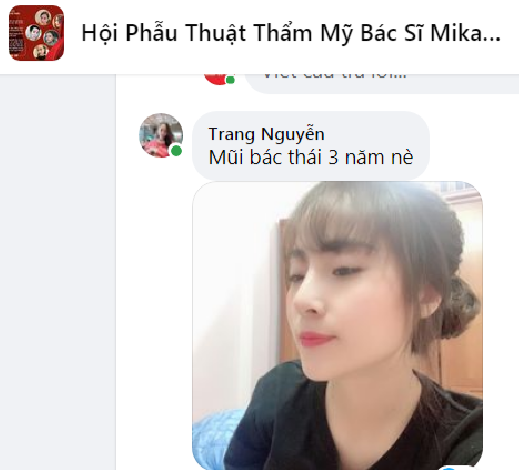 Hội phẫu thuật thẩm mỹ Bác sĩ Mika Vũ Thái vẫn là một nơi quen thuộc của các chị em chia sẻ, tâm sự hậu làm đẹp thẩm mỹ. Có rất nhiều thành viên sau khi phẫu thuật 3 năm, 5 năm, 8 năm…vẫn chia sẻ tin tức, diễn biến hậu làm đẹp đầy đủ, chi tiết cho các chị em khác tham khảo. Mới đây, những hình ảnh của cô nàng Trang Nguyễn sau 3 năm phẫu thuật nâng mũi tại Mika Vũ Thái cũng thu hút rất nhiều bình luận, sự chú ý của các thành viên trong Hội.