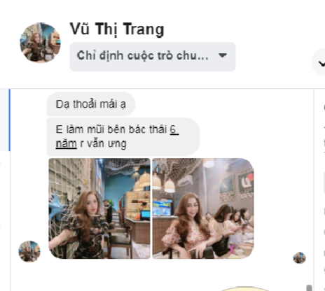 Sau một thời gian dài nâng mũi tại Mika Vũ Thái, cô nàng Vũ Trang đã bày tỏ niềm vui mừng với thẩm mỹ viện “Em làm mũi bên bác sĩ Vũ Thái 6 năm rồi vẫn xinh, vẫn ưng lắm ạ”. Theo lời chia sẻ của Trang, trước đây mũi của thấp tẹt, không có sống và đầu mũi khá to với phần cánh mũi dày.