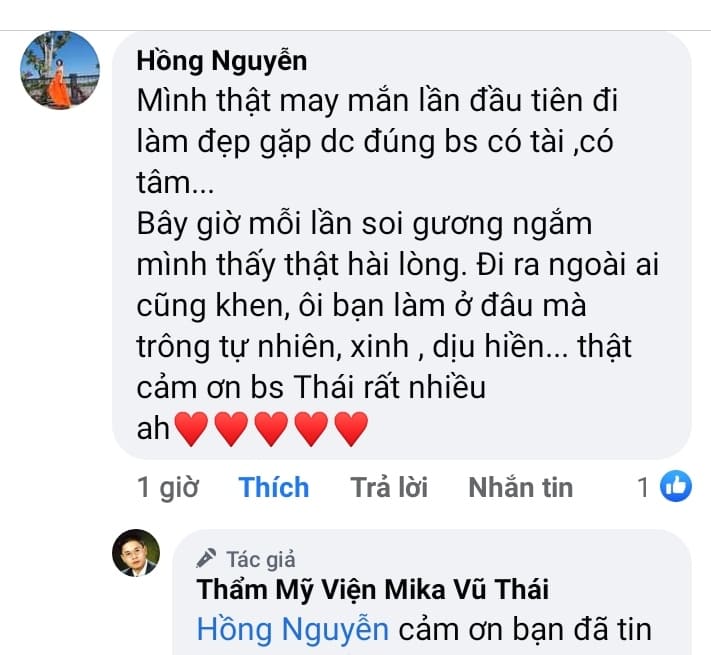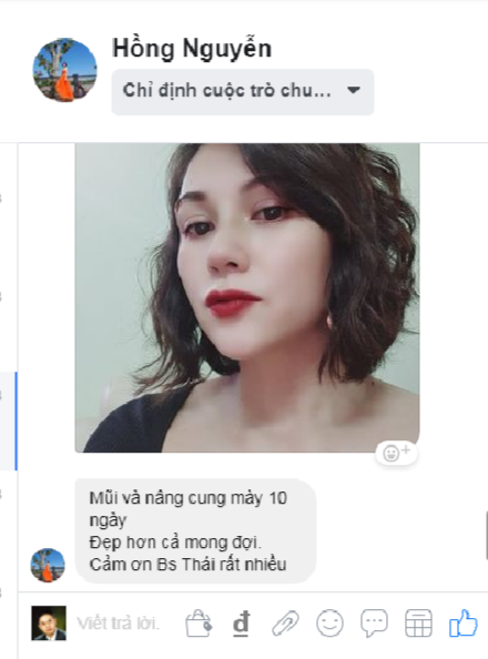 Chị Hồng Nguyễn sau phẫu thuật nâng mũi và nâng cung mày 3 tháng đã gửi lời tâm sự: “Mình thật may mắn lần đầu tiên đi làm đẹp gặp được đúng bác sĩ có tài, có tâm. Bây giờ mỗi lần soi gương ngắm mình thấy thật hài lòng. Đi ra ngoài ai cũng khen, Ôi bạn làm ở đâu mà trông tự nhiên, xinh, dịu hiền…thật cảm ơn bác sĩ Thái rất nhiều ạ”
