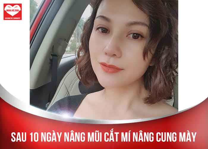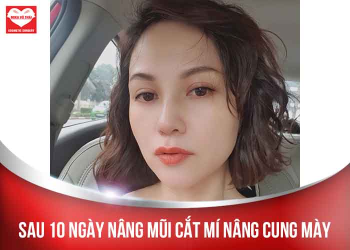 Mặc dù mới phẫu thuật được 10 ngày nhưng có thể dễ dàng nhận thấy dáng mũi hay đôi lông mày không bị sưng tím, bầm quá nhiều. Dáng mũi cũng có vẻ mềm mại và cao hơn tuy nhiên chưa thực sự được tự nhiên lắm, quá trình lành của vết thương cũng cần có thời gian.