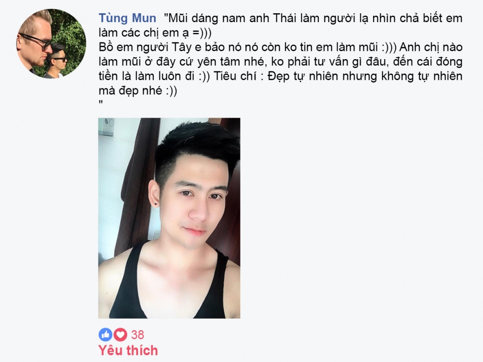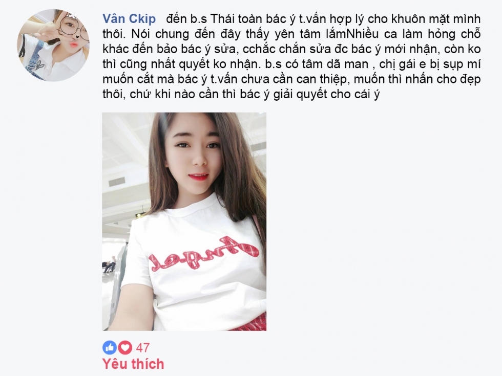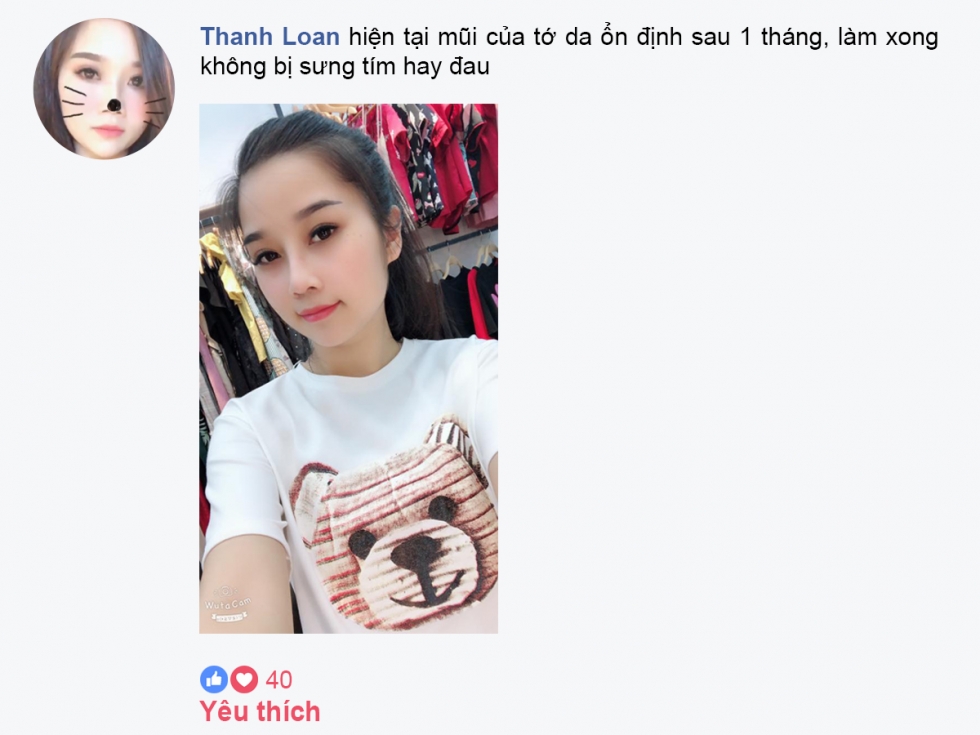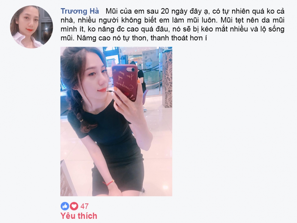 Giờ mà không nói là nâng mũi thì không ai phát hiện ra….Mũi làm được 5 năm rồi mà vẫn đẹp. Bác sĩ Thái mát tay quá…” Đó là những dòng chia sẻ của cô nàng Lily phun thêu gửi tới cho Mika Vũ Thái. Điều đặc biệt cô nàng còn chia sẻ thêm: “Em cũng bị con đập vào suốt đấy nhưng vẫn không sao”.