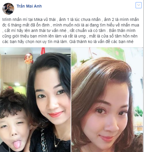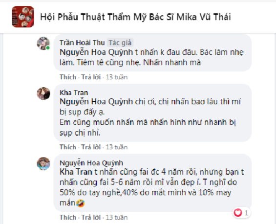 Khi được hỏi về cảm giác trong quá trình nhấn mí, cô nàng chân thành chia sẻ: “Tớ nhấn không đau đâu. Bác làm nhẹ lắm. Tiêm tê cũng nhẹ, nhấn mí nhanh mà”. Đồng tình với chia sẻ của Hoài Thu, bạn Hoa Quỳnh còn bình luận thêm: “Tớ nhấn mí ở bác sĩ Vũ Thái cũng phải được 4 năm rồi, nhưng bạn tớ nhấn cũng phải 5-6 năm rồi mà mí vẫn đẹp. Tớ nghĩ 50% do tay nghề, 40% do mắt mình và 10% may mắn”