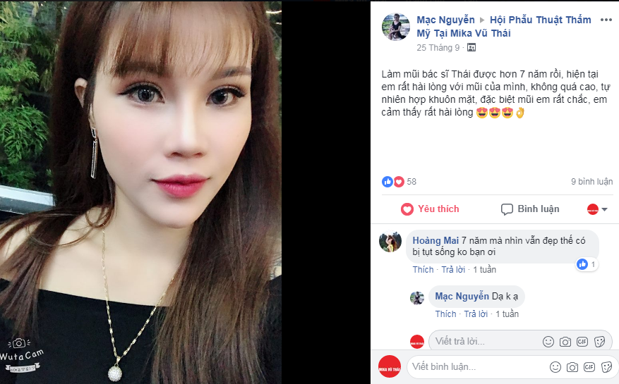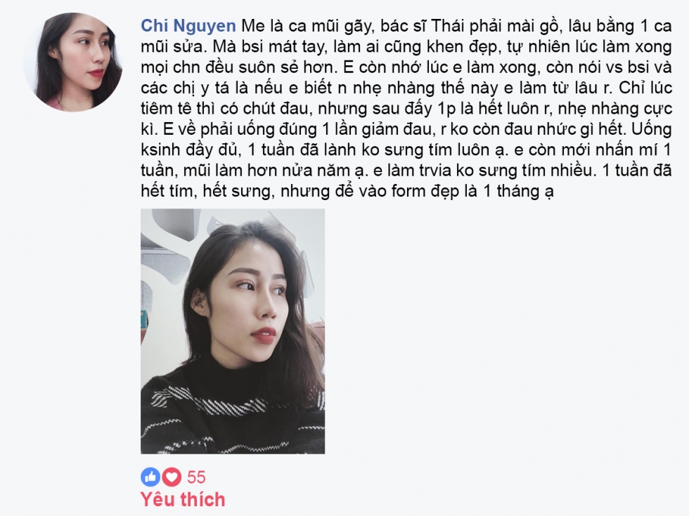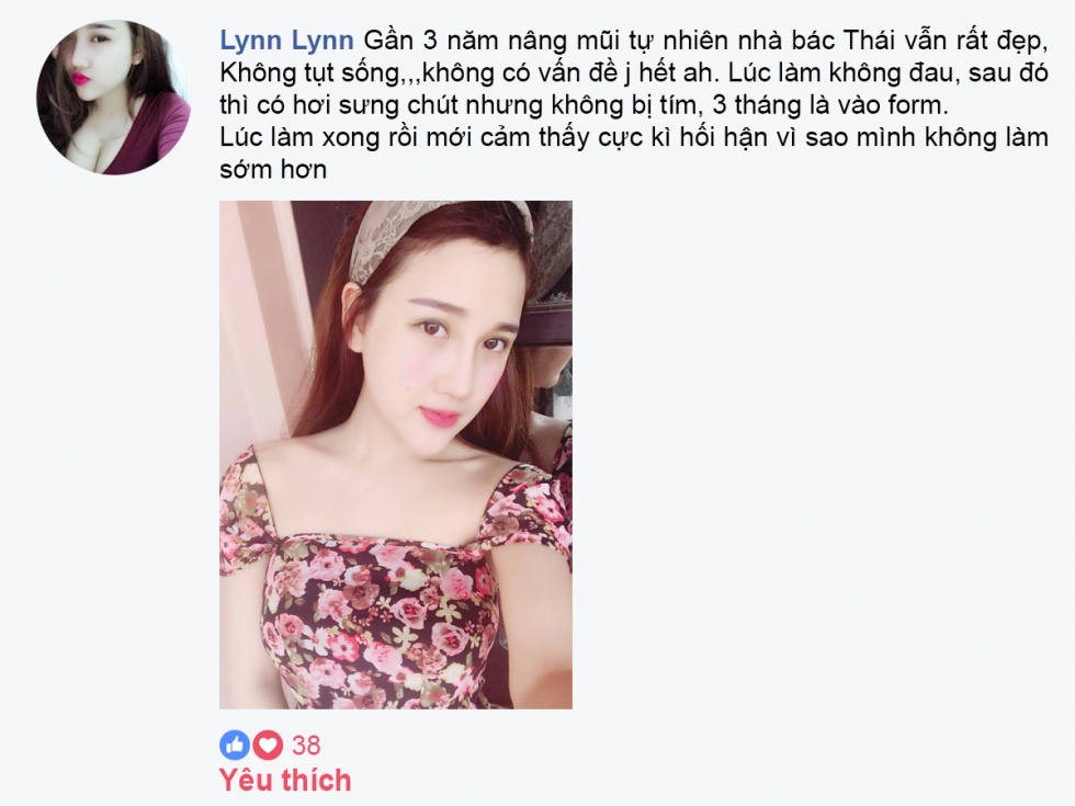 “Làm mũi bác sĩ Thái được hơn 7 năm rồi, hiện tại em rất hài lòng với mũi của mình, không quá cao, tự nhiên hợp khuôn mặt, đặc biệt mũi em rất chắc, em cảm thấy rất hài lòng…”