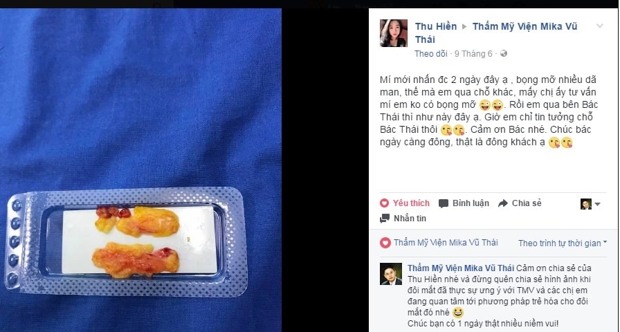 Cô chia sẻ hình ảnh lượng mỡ thừa lấy từ đôi mắt của mình: “Mí mới nhấn đc 2 ngày đây ạ , bọng mỡ nhiều dã man, thế mà em qua chỗ khác, mấy chị ấy tư vấn mí em ko có bọng mỡ. Rồi em qua bên Bác Thái thì như này đây ạ. Giờ em chỉ tin tưởng chỗ Bác Thái thôi . Cảm ơn Bác nhé. Chúc bác ngày càng đông, thật là đông khách ạ ..”