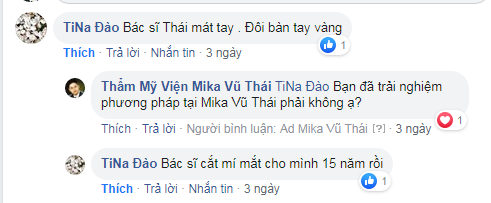 “Bác sĩ Vũ Thái mát tay, đôi bàn tay vàng. Bác sĩ đã cắt mí mắt cho mình được 15 năm rồi.Đến nay mắt vẫn đẹp. ” Đó là chia sẻ của chị Tina Đào trong