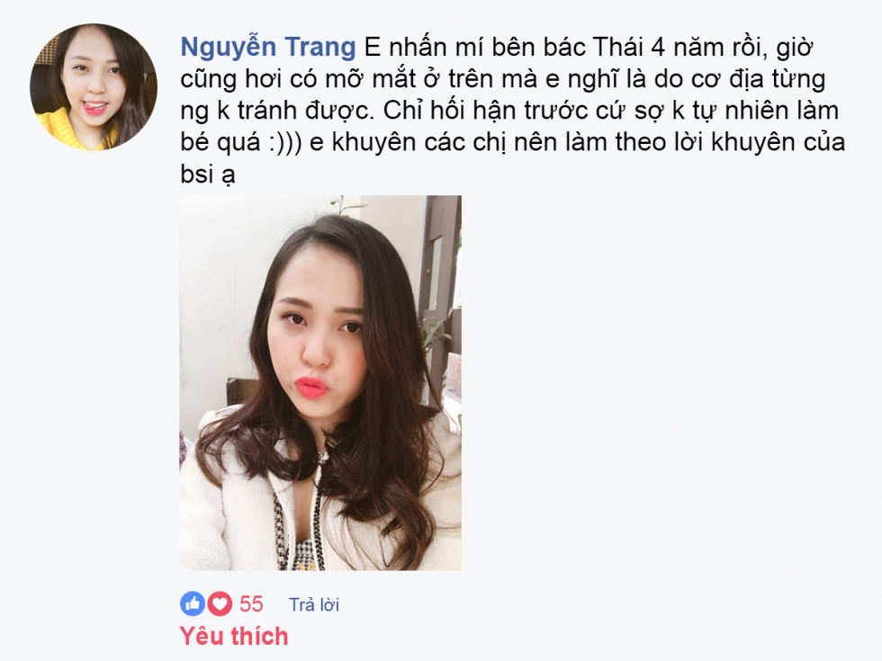 Dưới đây là chia sẻ thực tế của khá nhiều chị em đã từng thực hiện nhấn mí, nhấn mí kết hợp với các giải pháp khác như mở góc mắt, bóc mỡ mắt, hút mỡ nội soi… và kết quả khiến mọi người cam thấy hài lòng.
