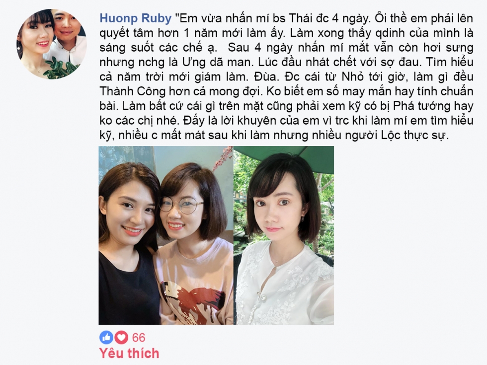 Lúc nào bác sĩ Vũ Thái cũng làm rất nhẹ nhàng, không hề đau,l úc làm xong về nhà chị không cần uống thêm viên thuốc giảm đau nào cả. Còn sau làm có bị sưng tím không thì chị nghĩ tất nhiên ai cũng sưng tùy thuộc vào cơ địa của mình ,người thì sưng lâu,người thì sưng nhanh,nhưng với chị thì có 3 ngày là cũng ổn rồi.”
