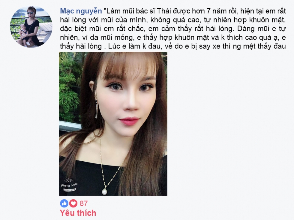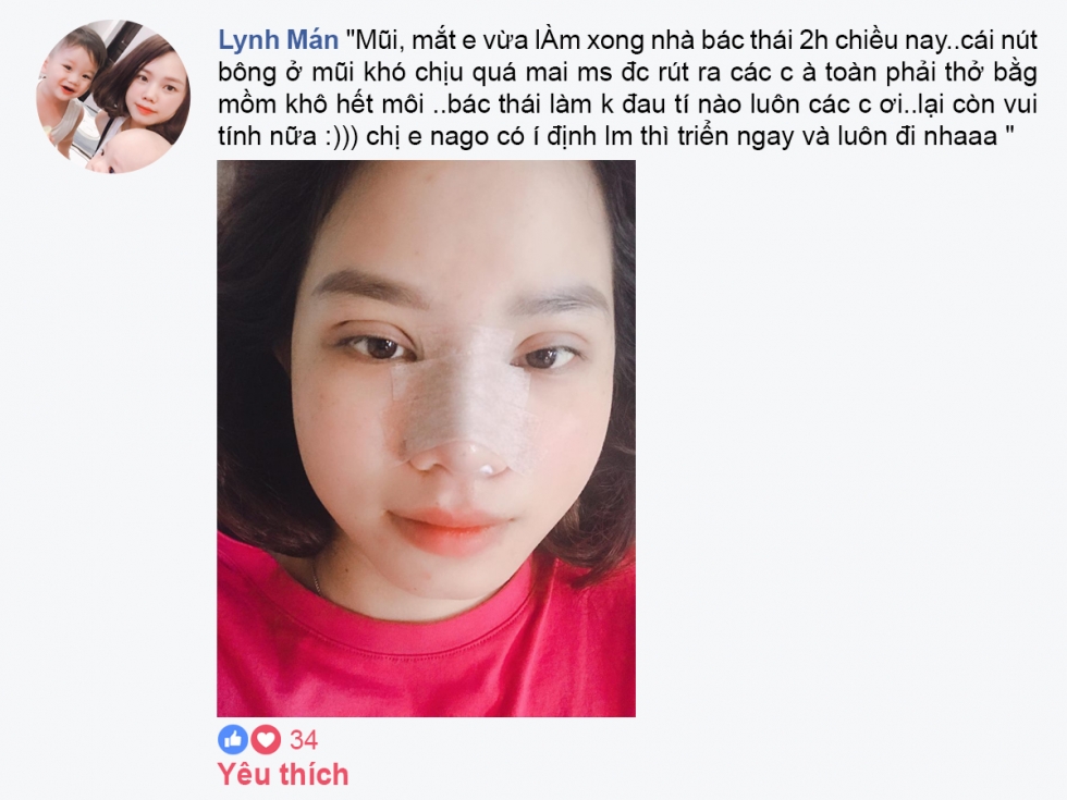 Chia sẻ lại quá trình nâng mũi của mình, chị nói thêm: “Chị cảm tưởng mình bị đứt tay còn thấy đau nhức mấy ngày chứ làm mũi không hề đau đớn gì nhẹ như lông hồng. Từ lúc Bác sĩ đang làm cho đến khi về nhà chưa hề biết đau một phút nào