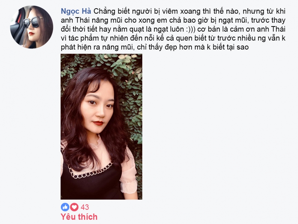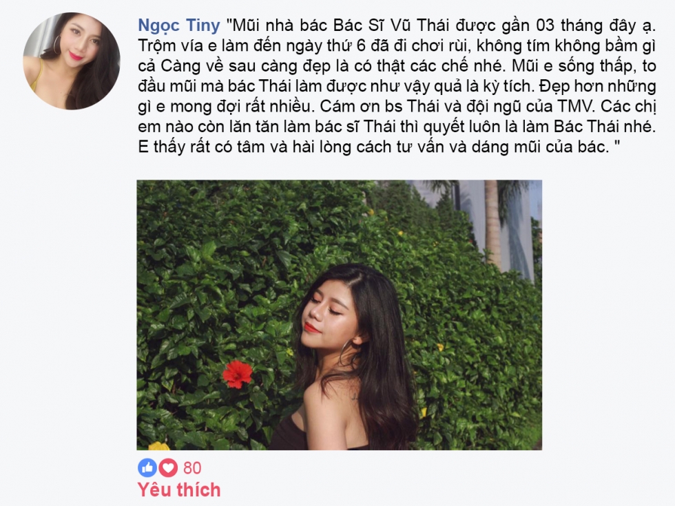 “Cám ơn Bác si Vũ Thái ,mũi em vừa tròn hai tháng mà bây giờ mềm tự nhiên lắm ai cũng khen đẹp ,em rất hài lòng với phom mũi anh làm cho em…” Là chia sẻ của chị Cocacola Vũ gửi tới Mika Vũ Thái, bày tỏ cảm xúc của mình sau khoảng 2 tháng được chính Bác sĩ Vũ Thái 20 năm kinh nghiệm tư vấn và sửa mũi.