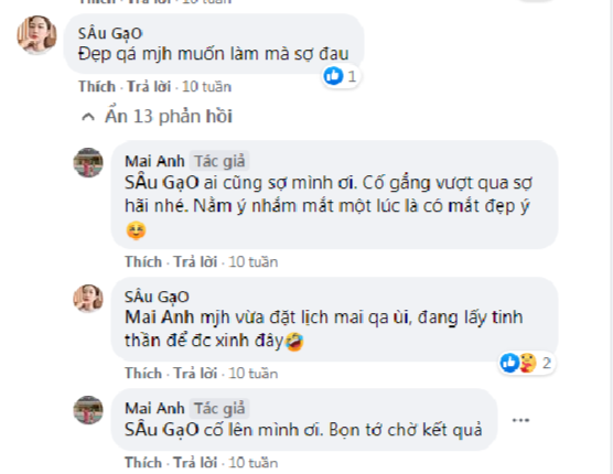 Rất nhiều chị em cảm thán trước vẻ đẹp hiện tại của cô nàng. Có bạn cũng chân thành tâm sự: “ Đẹp quá, mình muốn làm nhưng sợ” thì Mai Anh động viên ngay: “Ai cũng sợ mình ơi. Cố gắng vượt qua sợ hãi nhé. Nằm nhắm mắt một lúc là có mắt đẹp ý.”…Trước những lời khẳng định, truyền cảm hứng từ Mai Anh và những bạn đã làm khác, cuối cùng cô nàng có nick Sâu Gạo quyết định: “ Mình vừa đặt lịch mai qua rồi, đang lấy tinh thần để được xinh đây”. Chúc cho bạn gái này sẽ có được đôi mắt đẹp như mong đợi của bản thân.
