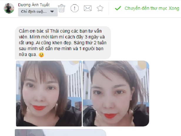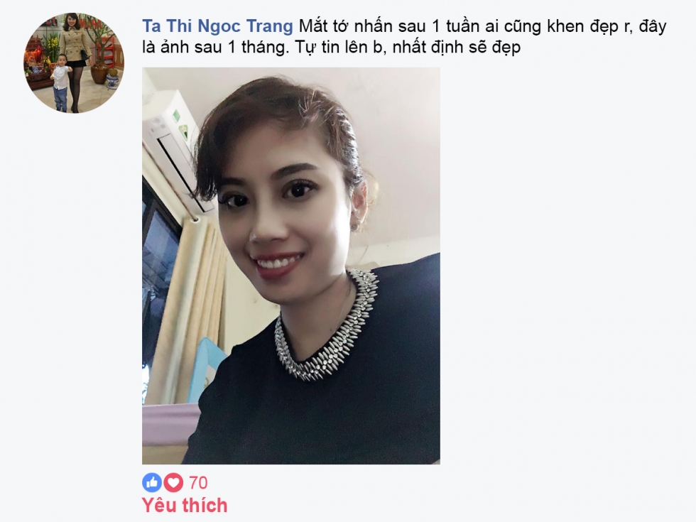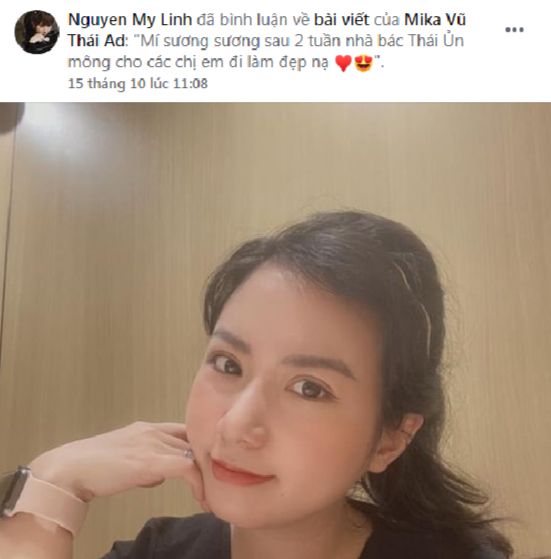 Trong Hội phẫu thuật thẩm mỹ Bác sĩ Mika Vũ Thái, bạn Mỹ Linh đã có những chia sẻ dưới chủ đề liên quan tới phương pháp nhấn mí mắt: “ Mí sương sương sau 2 tuần nhà bác Thái. Ủn mông cho các chị em đi làm đẹp”