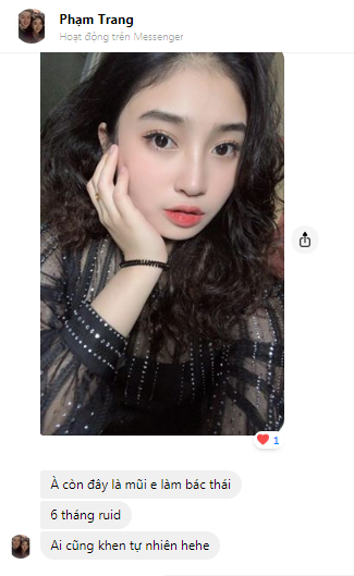 “Đây là mũi em làm bác sĩ Vũ Thái 6 tháng rồi, ai cũng khen đẹp tự nhiên…Em không bị đau trộm vía không sưng chỉ hơi tím tí sống thui. Thuốc giảm đau bên mình cho em không phải dùng viên nào” Đó chính là đôi lời tâm sự của Phạm Trang đầy hào hứng, nhiệt tình với Mika Vũ Thái sau khi dáng mũi của mình có được vẻ đẹp như mong đợi sau 6 tháng phẫu thuật nâng mũi.