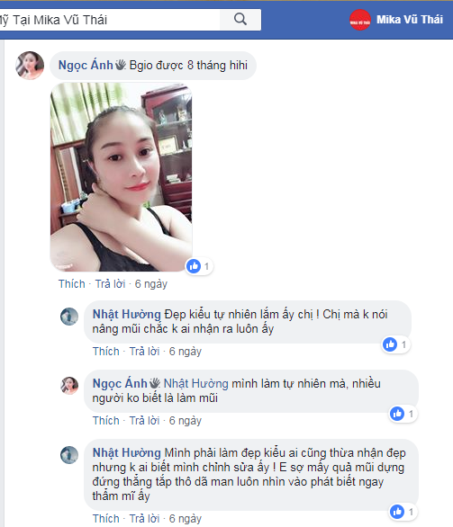 “Cảm ơn bác sĩ thẩm mỹ Vũ Thái...e làm thẩm mỹ mũi của anh từ năm 2011 đến giờ ai cũng khen rất đẹp tự nhiên và nhìn khuôn mặt e gọn gàng hẳn lên. Đặc biệt 7 năm nay e ko thấy hiện tượng ảnh hưởng hay biến chứng gì về mũi. Cảm ơn anh rất nhiều.” Đó là đôi dòng tâm sự của bạn Thanh Thuy Nguyen sau 7 năm phẫu thuật nâng mũi tại Mika Vũ Thái trong