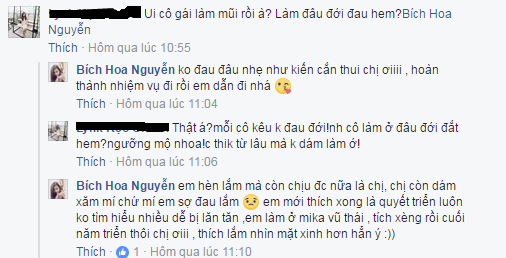 Nhớ lại ngày phẫu thuật, Bích Hoa kể lại : “Bác sĩ làm nhẹ nhàng mà hồi phục nhanh lắm. Làm không đau một tí nào, chỉ như kiến cắn thôi. Chưa đến 5 ngày mà mũi đã không sưng tím gì. Bác sĩ đúng là không hổ danh bàn tay vàng làm vừa nhẹ nhàng lại còn hồi phục nhanh.
