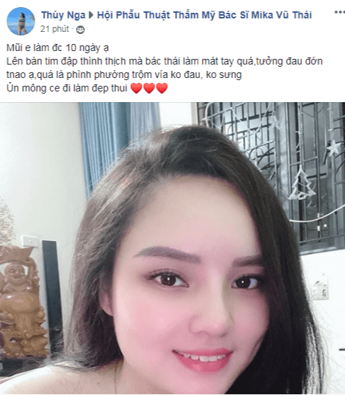 Trong Hội phẫu thuật thẩm mỹ bác sĩ Mika Vũ Thái, chia sẻ của bạn Thúy Nga sau 10 ngày nâng mũi gần đây đã nhận được rất nhiều sự cảm ơn, bình luận của các chị em đang quan tâm tới phương pháp làm đẹp này. Cô nàng viết: “ Mũi em làm được 10 ngày ạ. Lên bàn tim đập thình thịch mà bác sĩ Vũ Thái làm mát tay quá, tương đau đớn thế nào ạ, quá là phình phường trộm vía không đau, không sưng tím. Ủn mông chị em đi làm đẹp thui”