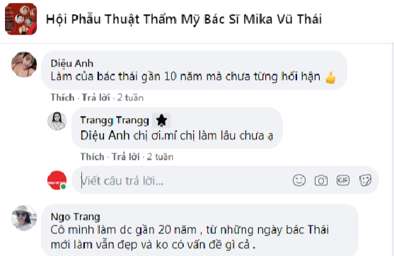 Trong Hội phẫu thuật thẩm mỹ Bác sĩ Mika Vũ Thái, dưới bài đăng của một bạn nữ mong được mọi người review nâng mũi bác sĩ Vũ Thái có rất nhiều bình luận chia sẻ lại kinh nghiệm, giải đáp băn khoăn về chuyện nâng mũi thì đôi lời: “ Làm 10 năm của bác sĩ Vũ Thái chưa từng hối hận” đến từ Diệu Anh đã thu hút sự quan tâm của các chị em.