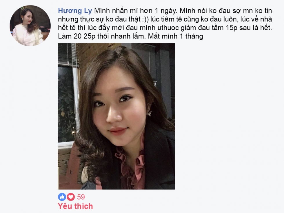 “Bác sĩ làm nhanh lắm, mình thì không nhìn thấy gì lúc đó nhưng cứ cảm thấy bác sĩ làm thoăn thoắt ấy thôi. Tí cái là đã xong rồi mà cũng không thấy đau đớn gì cả nha. Mình nghĩ bác sĩ nào càng lành nghề, làm càng nhanh thì mình càng ít đau. Cứ tưởng tưởng bây giờ một chỗ đau của mình bị day đi day lại sẽ đau hơn rất nhiều so với một phát xong luôn đúng không…” Đó là chia sẻ rất dễ thương của một chị khách hàng tới cắt mí và hút mỡ mắt khi “tư vấn” cho những khách hàng khác.