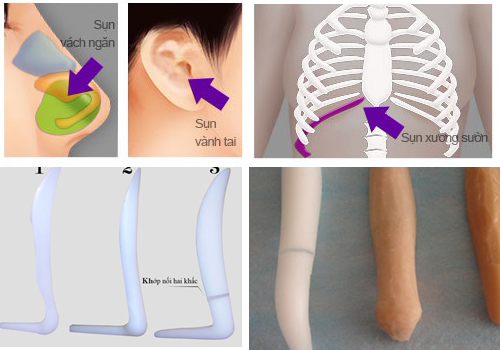 Hình ảnh minh họa cho các loại sụn được sử dụng trong phẫu thuật nâng mũi hiện nay. Nâng mũi bằng sụn tự thân - phần sụn này có thể được lấy từ sụn sườn, sụn vành tai hoặc sụn vách ngăn của mũi bọc lót phần đầu mũi hoặc giữa sống mũi. Phương pháp này sẽ giúp cho đầu chóp mũi bớt hiện tượng nhọn hoặc căng bóng đỏ vì sử dụng phần sụn từ chính cơ thể của mình.