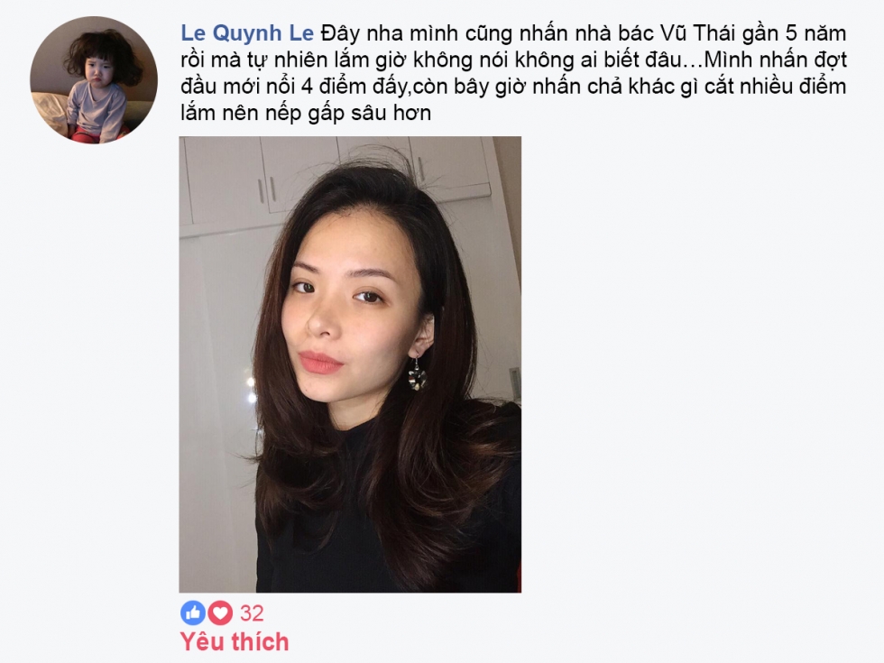 Lê Quỳnh: “Đây nha mình, mình cũng nhấn nhà bac ssix Vũ Thái gân 5 năm rồi mà tự nhiên lắm, giờ không nói không ai biết đâu…Mình nhấn đợt đầu mới nối 4 điểm đấy, còn bây giờ nhấn chả khác gì cắt nhiều điểm lắm nên nếp gấp sâu hơn”