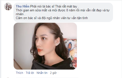 Thu Hiền: “Phải nói là bác sĩ Thái rất mát tay. Thời gian em sửa mắt và mũi được 8 năm rồi mà vẫn rất đẹp và tự nhiên. Cảm ơn bác sĩ và đội ngũ nhân viên tư vấn tận tình”