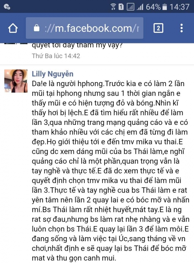 Họ giới thiệu tới em đến TMV Mika Vũ Thái. Em cũng được xem dáng mũi của bác sĩ Thái làm, em nghĩ quảng cáo chỉ là một phần, quan trọng vẫn là tay nghề và thực tế. Em đã được xem thực tế và em quyết định chọn tmv Mika Vũ Thái để làm mũi lần 3.