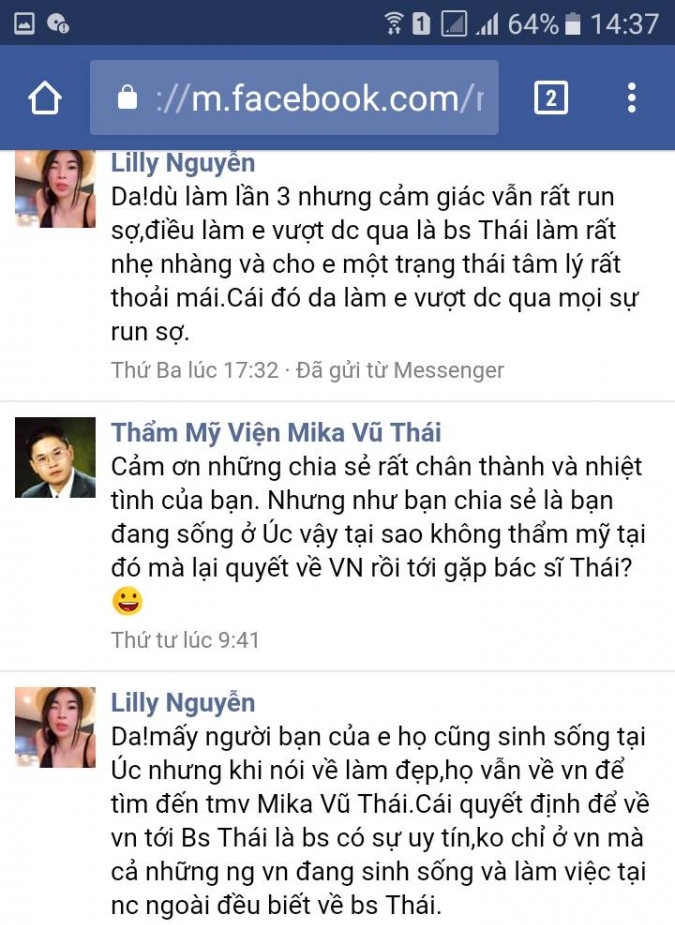 Thực tế và tay nghề của bác sĩ Thái làm em rất yên tâm nên lần 2 quay lại em lại tiếp tục bóc mỡ và nhấn mí ở bên tmv Mika Vũ Thái. Em là người rất sợ đau, nhưng bác sĩ làm rất nhẹ nhàng và em vẫn luôn chọn bác sĩ Thái. Em quay lại lần 3 để làm môi. Em đang sống và làm việc ở Úc…”