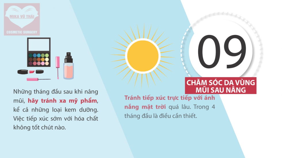 Những tháng đầu sau khi nâng mũi, hãy tránh xa mỹ phẩm, kể cả những loại kem dưỡng. Việc tiếp xúc sớm với hóa chất không tốt chút nào. Cũng như hóa mỹ phẩm, ánh nắng mặt trời cũng vậy, tránh tiếp xúc trực tiếp với ánh nắng mặt trời quá lâu trong 4 tháng đầu là điều cần thiết.
