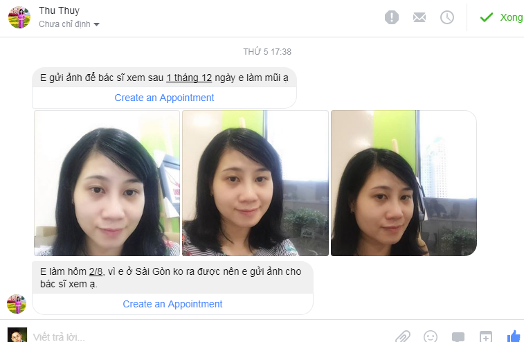 Em gửi ảnh để bác sĩ xem sau 1 tháng 12 ngày em làm mũi ạ. Vì em ở Sài Gòn không ra được nên em gửi ảnh cho bác sĩ xem ạ…”. Có thể thấy mặc dù hiện tại dáng mũi đã ổn định, không vấn đề gì nhưng cô nàng vẫn không hề chủ quan và cố gắng thực hiện tốt nhất khâu hậu phẫu thuật.